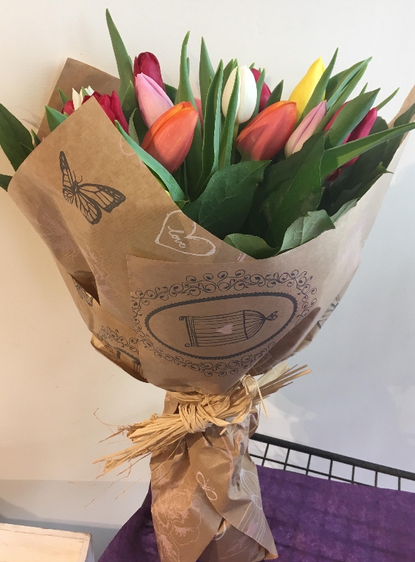 Hand tie of all mixed tulips.