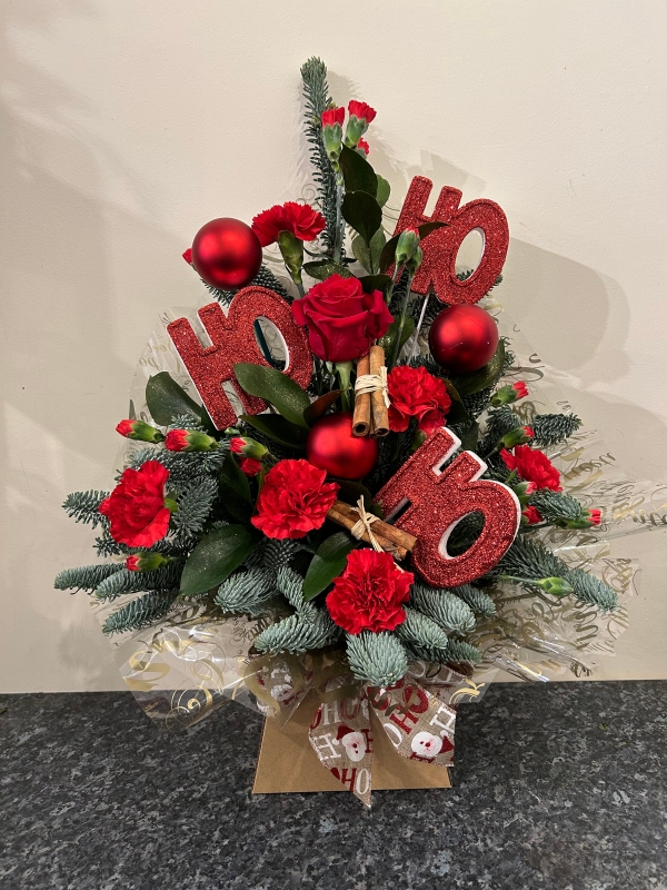 A stunning Christmas arrangement made in oasis with Christmas foliages, cinnamon and baubles.