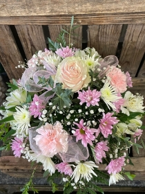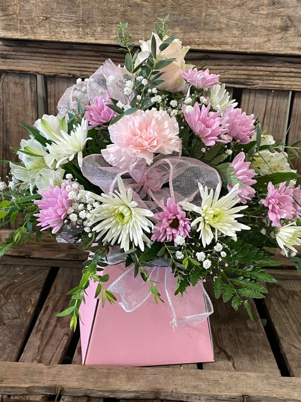 Box contains, Rose, Chrysanth, Carnations and Gyp.