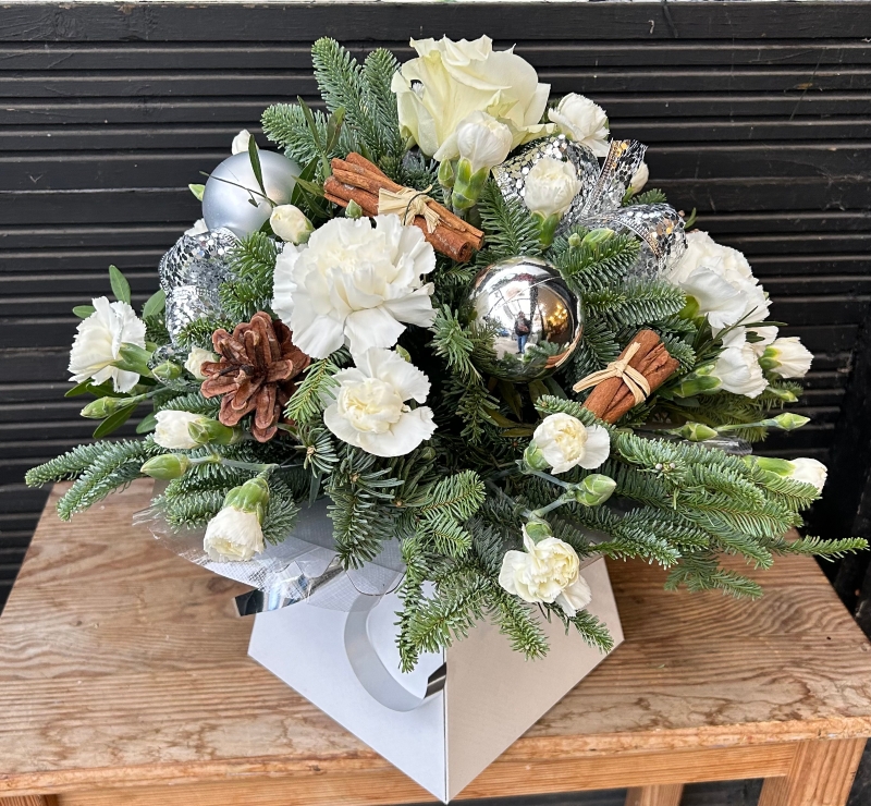This design includes pine, pine cones, cinnamon, baubles, carnations and spray carnations with a white rose in the centre.
