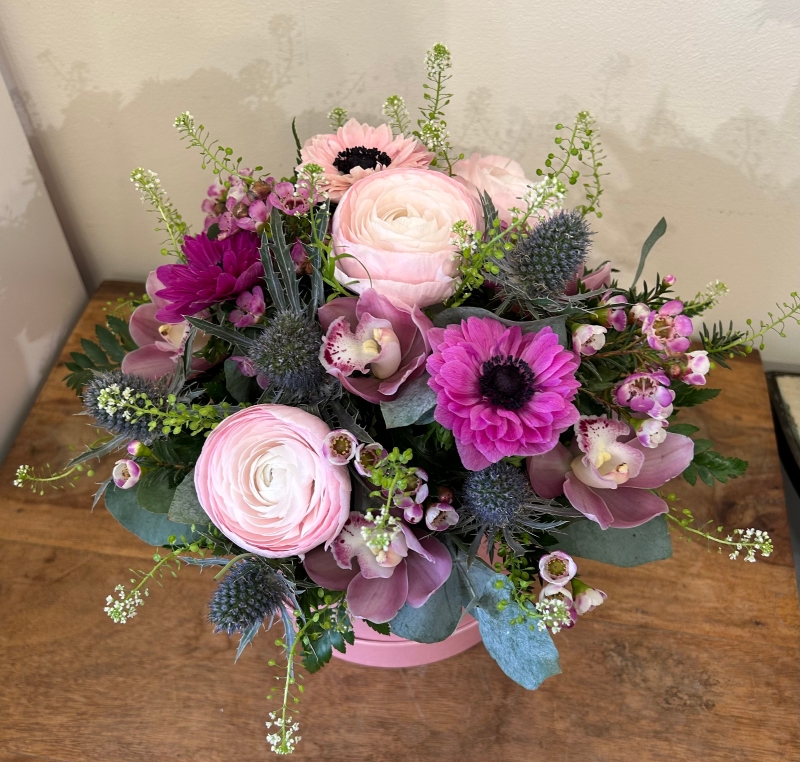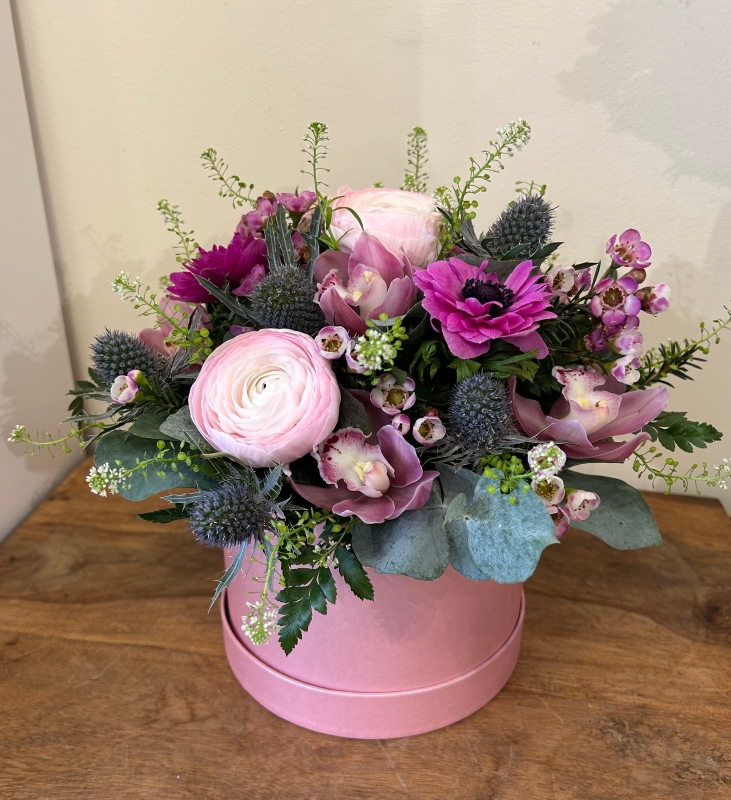 Gorgeous pink hat box filled with seasonal pink flowers