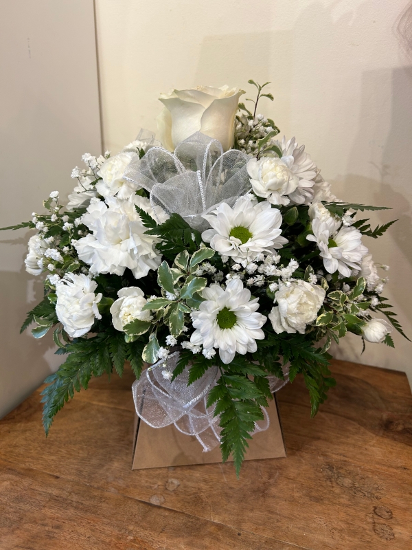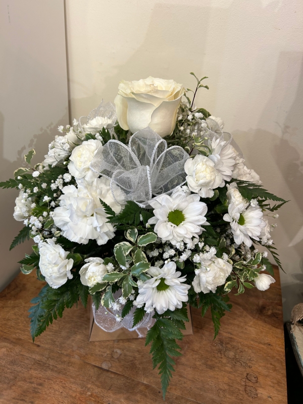 Our popular design Emma made in all white flowers.