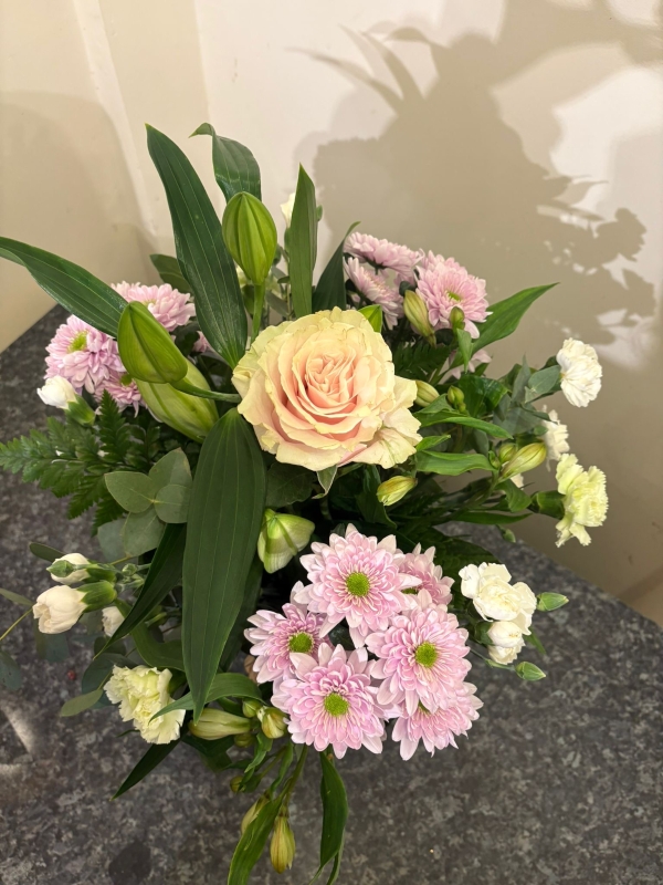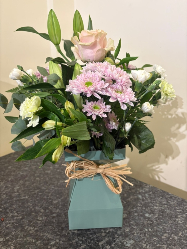 Stunning new sage green boxes made with a scented lily, pink rose, alstroemerias, carnations, spray carnations and chrysanth.
