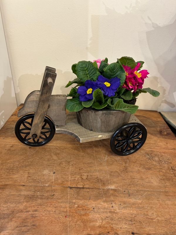 A lovely wooden bicycle planted with 3 different poly plants in.