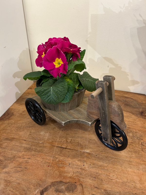 A lovely wooden bicycle with a bright pink poly in.