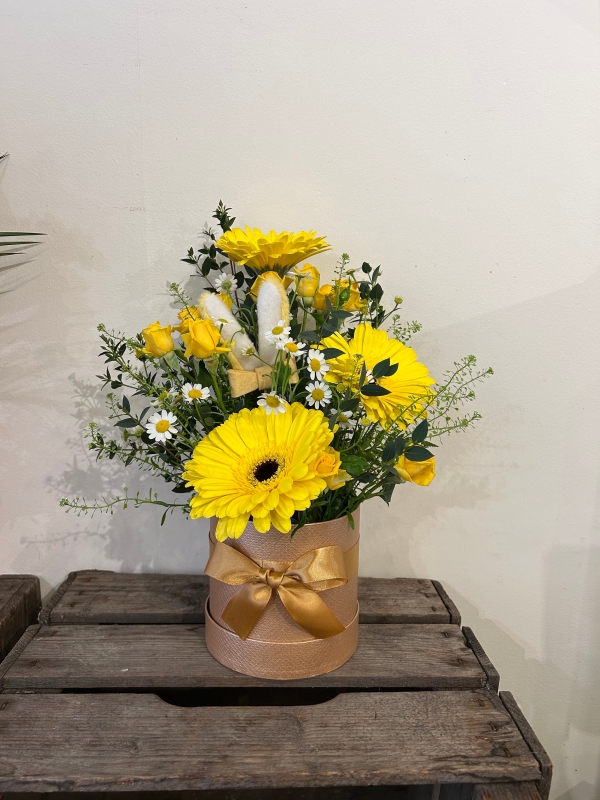 A lovely arrangement of gerberas and spray yellow roses with daisies and foliages, all made in oasis in a gold hat box with yellow bunny ears.