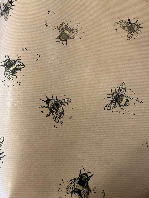 A lovely mix of spring flowers wrapped in this stunning bee paper with a raffia bow.